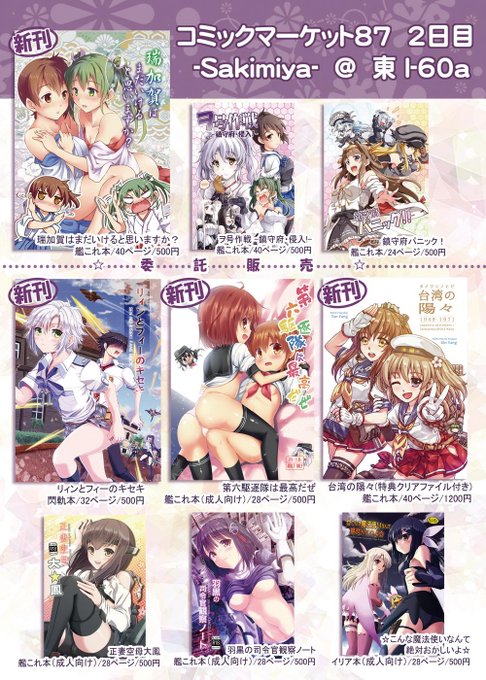 C87お品書きです、2日目東I-60a「-Sakimiya-」でお待ちしております、委託販売の方々にもよろしくお願いしますー
