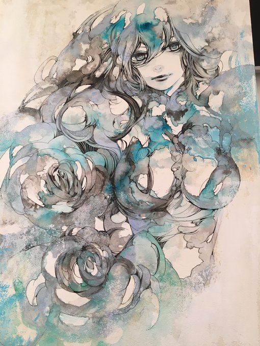 染みみたいな下絵ってツイートしたのに線を入れてみました。こんな感じ。 色を更に塗り足し加筆したら完成です。 原画販売用の絵はこんな感じのと、ペンのみの白黒絵の2種です。