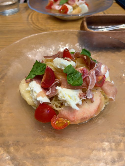 シャルドネ。白桃と生ハム、モッツァレラの冷たいスパゲッティ。