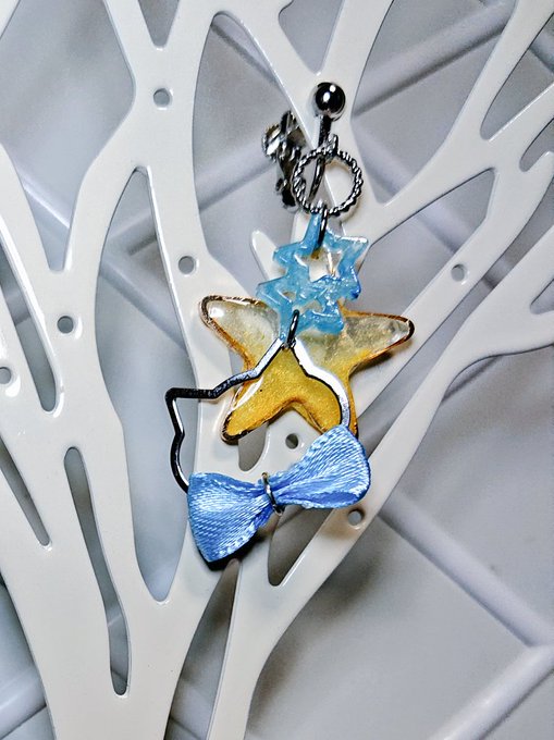 後ろの星は黄色から透明へのグラデーション!猫のメタリックフープには水色のおリボンを着けてみましたー。