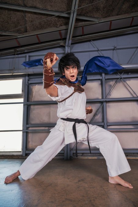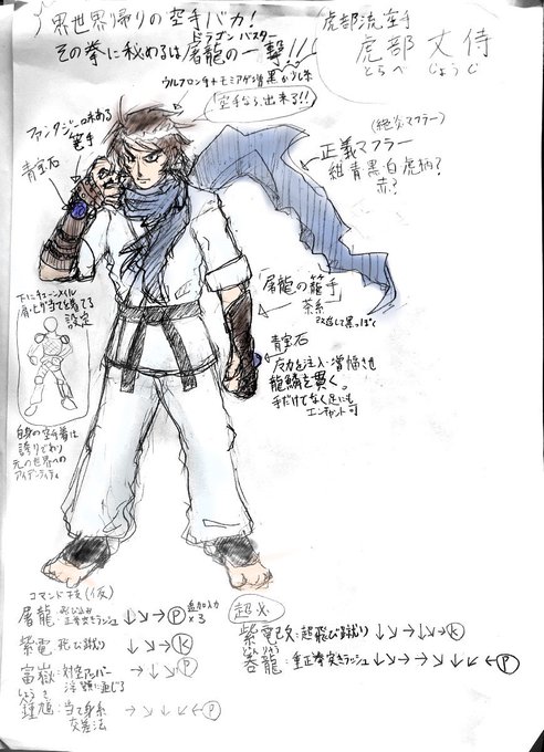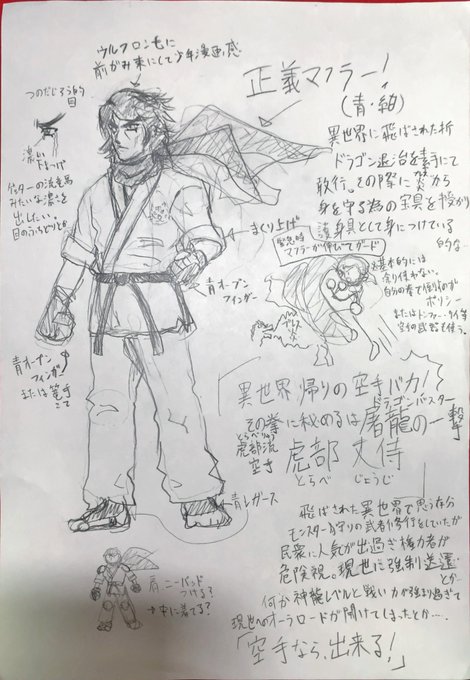 @yukiswitch422 #創作格ゲーDENZIN の虎部の例で言えば、ザクッと真似するキャラ(空手バカ設定なので空手バカ一代)で用意し易さと映えを模索。その後に異世界要素という事で、ゲッターロボの流竜馬とマフラーと籠手を加えてみました。
