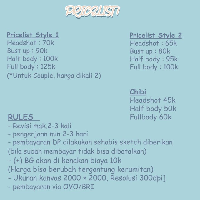 Haloo,, karna aku udah masuk waktu liburan aku bakal buka commission lagi dengan 2 tipe style kayak sebelumnya (bisa liat di bawah)
