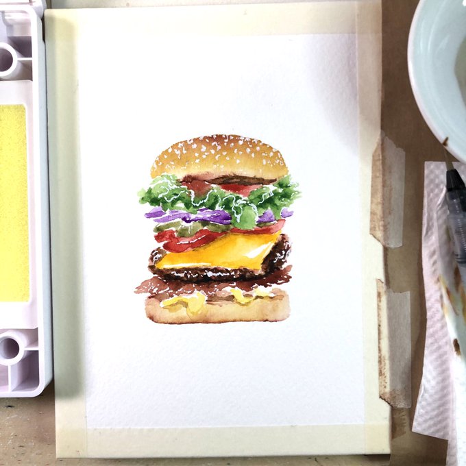 【シンプル水彩】続きまして透明水彩の新作…というほどのものでもないんですけどハンバーガー描いた。 描き方は… 「色を置いて、のばすだけ」 いえいえ、本当に。ほんとほんと。 作画動画を今晩19時にYouTubeで配信します。 #楽画教室 #透明水彩 #飯テロイラスト部