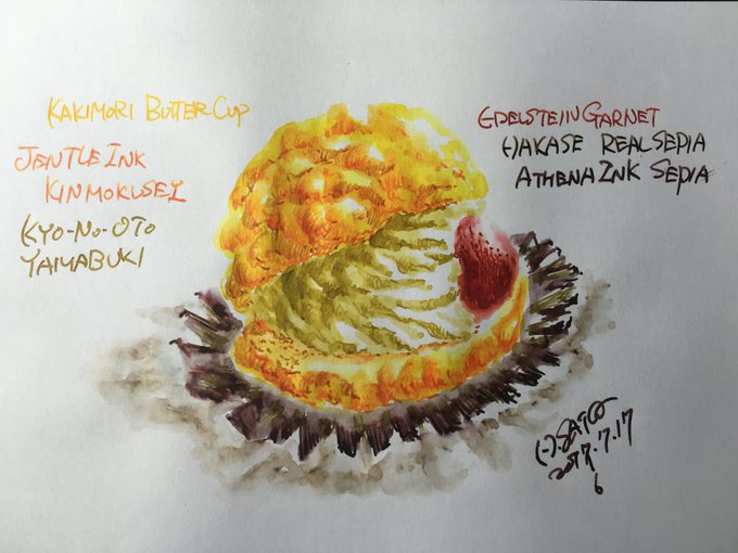 こちらが、本日作成した2枚のイラストになります! シュークリームには使用したインクを追記させていただきました。 間違えた日付は記念にそのままで(笑)