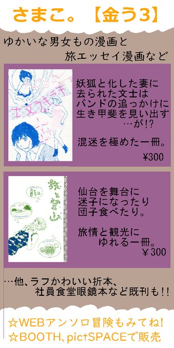 20220910「まだまだ!ジャンル迷子オンリー」に参加します! #pictSQUARE #お品書き #オンライン #一次創作 #オリジナル #エッセイ漫画 #青年漫画 https://t.co/CLLq6VxCxE