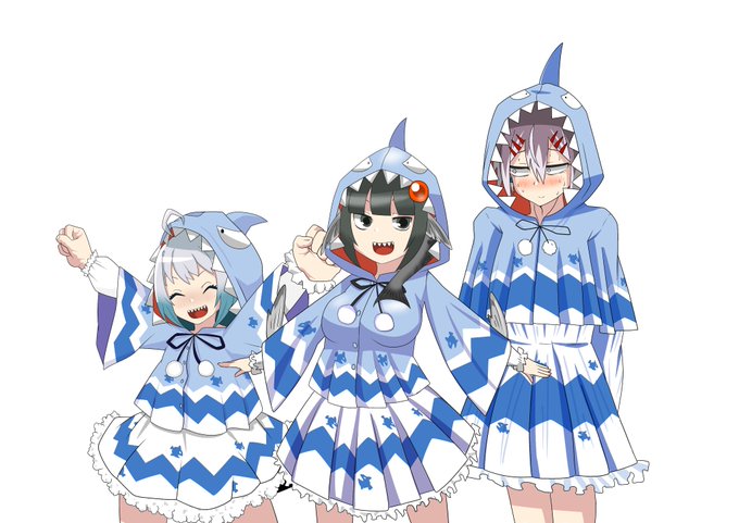 麻宵くんといくらちゃんにサメコート着せて並べました! みんな「てえてえ・・」 描き手も並びました 良識のあるみんな「なんで・・・?」