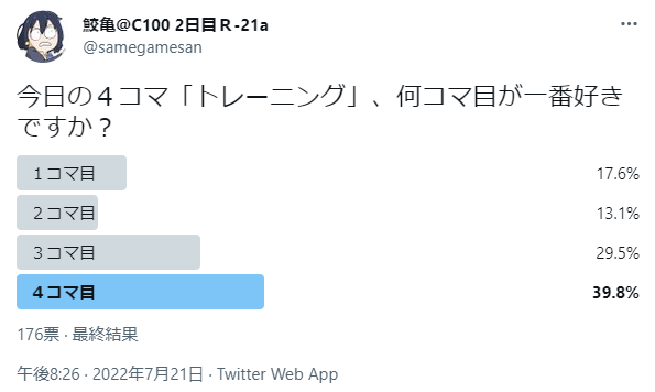 7月21日に描いた4コマのコマの人気投票の結果が出たのでいただいてないコメントと共に発表します