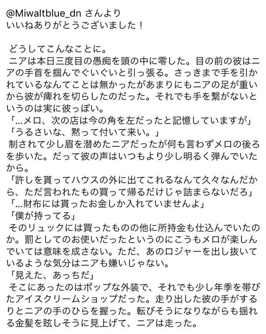 #いいね押した人の素敵イラストにSSを添える (@Miwaltblue_dn ) やっと一本目でございます…!NMお借りしました!※画像転載許可頂いております。 ミワさんタグに反応ありがとうございました!✨