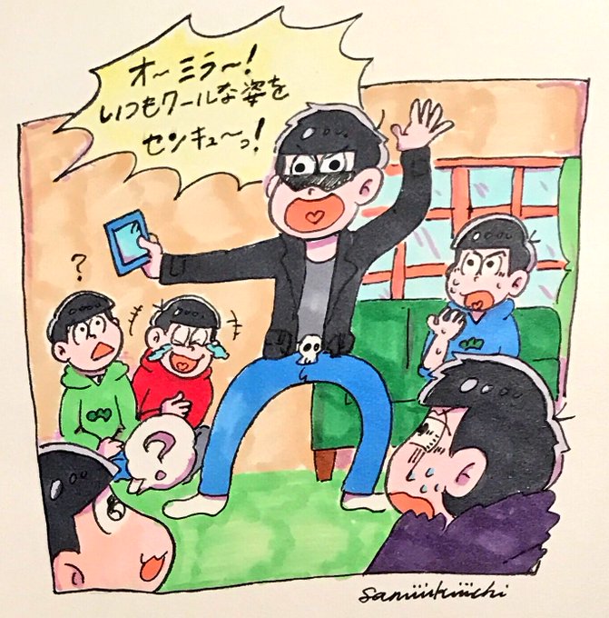 私この絵地味にすごい好きで部屋に飾ってるんだけどあんま話題にならんよね...😰❗️昨今のようにあまりあざとくないみんなの表情が好きだ...。特に寿司職人チョロ松がツボだ...。似合いすぎでしょ😧🍣