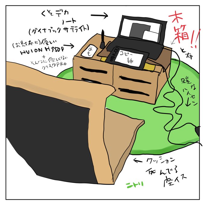 こんな環境で絵描いてるから腰が死ぬんやで。(自戒) そろそろこの苦学生スタイルやめて〜な