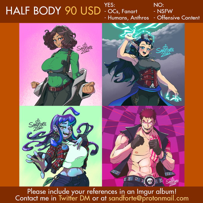 5 SLOTS for either half-body, or character sheet w/ design fee included; do DM me for details.
