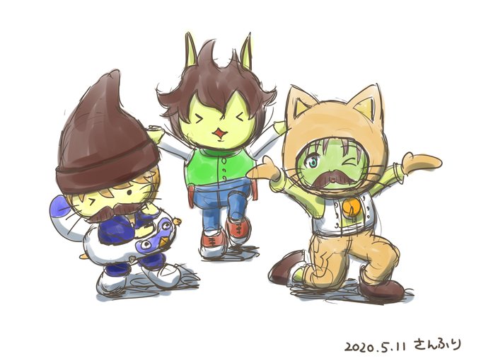 決めポーズ三銃士を描いたよー(左から、さんふり、トラビスさん、きんばりーさん) #アストルティア美術部