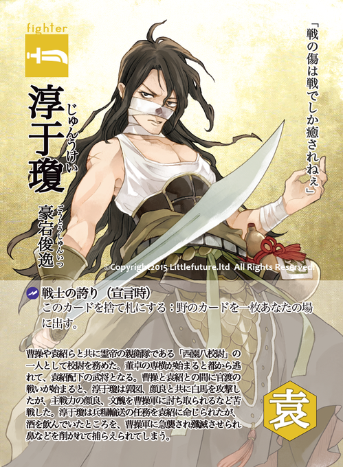 11月発売予定の拡張セット「英雄たちの邂逅」より袁紹配下「淳于瓊」です。三国志演義では深酒での失敗が有名ですが、後漢の霊帝時代の淳于瓊は、直属の親衛隊「西園八校尉」として曹操や袁紹と席を並べていました。