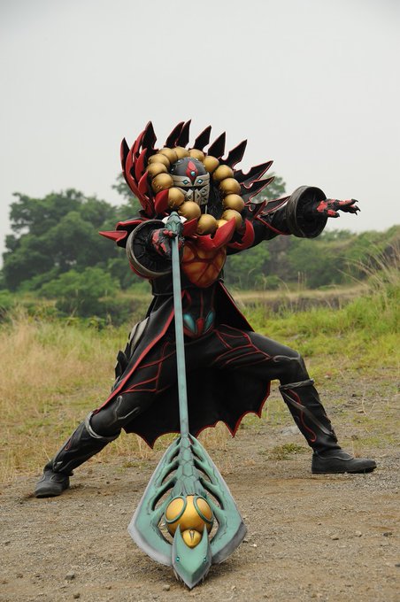 画像はガンマイザー・グラビティとガンマイザー・ファイヤーが融合した姿。グラビティの青色とファイヤーの赤色を混ぜた紫色のオーラを放っている。
