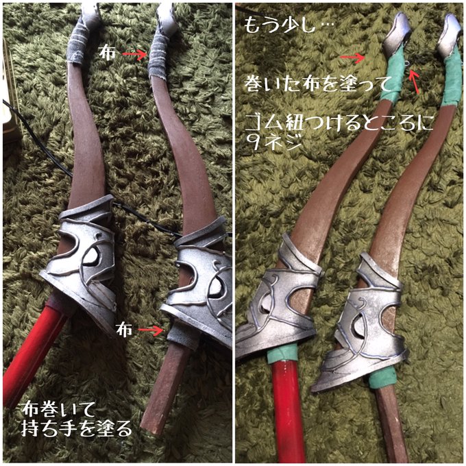④旅人の弓(完成) やっとできたー! ゴム紐はもっといいゴム見つけたら交換します…(´-`).。oO 武器では弓が一番好き。 ブレワイに限らず。僕は中距離型! #さぁのランド
