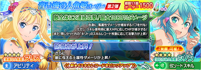 ■「青い海の人魚姫オーダー第2弾」開催! 人魚姿のシノンとアリスの★4スキルレコードが新登場! 新★4スキルレコードは出現率アップ中! ★4【はにかみ人魚姫】シノン(覚醒可能!) ★4【美麗な人魚姫】アリス 初回11回オーダーは《1500アルカナジェム》! #SAOIF #SAO