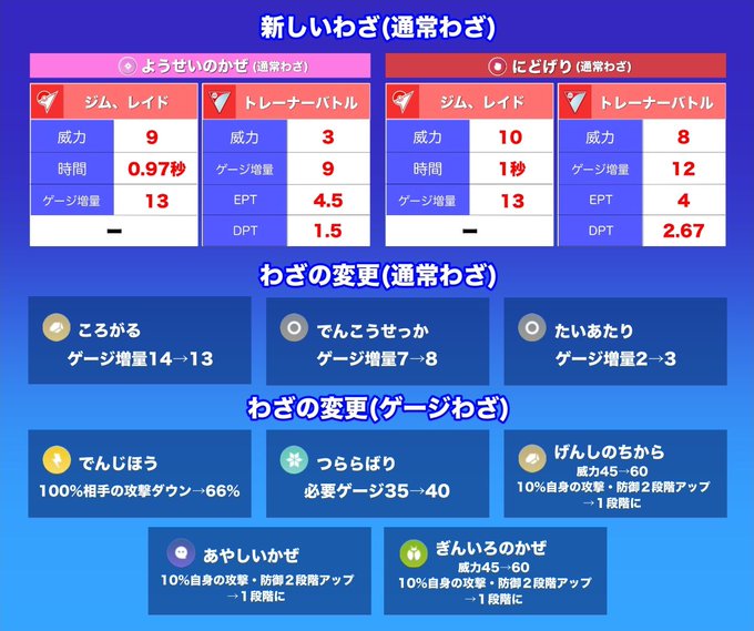昨日のライブ配信の画像を共有してほしいというコメントがあったので載せておきます! 1枚目:新しいわざ&修正されたわざ 2枚目:わざが追加されたポケモン