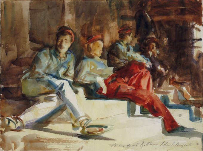 Contrary to popular belief, when Sargent began work with in 1907, it was not bc he hated portraits - rather he was bored! Quick portraits enabled him time to travel the world & pursue new forms of art, like the watercolour, and this new sense of leisure dominated his later career