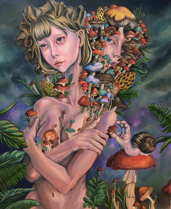 描き途中。 キノコと🍄アダムスキー型UFO🛸と ゴミ捨てに行く女の絵。 #art #artwork #illustration