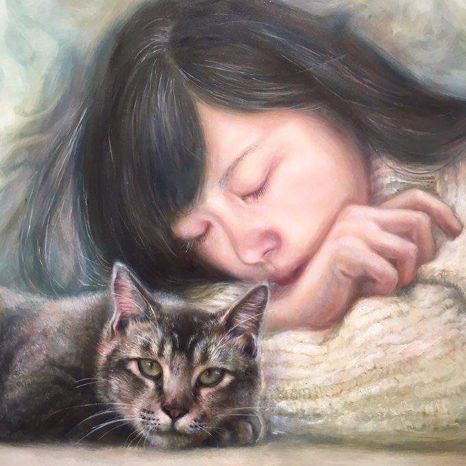 松本実桜さんの作品「どこかのソラで」(6F、油彩) (作品画像は部分です。) 眠る少女に寄り添う優しい眼差しの猫ちゃん🐱動物が大好きな松本さんらしい、あたたかい作品です✨ #猫 #猫画像 #ねこ