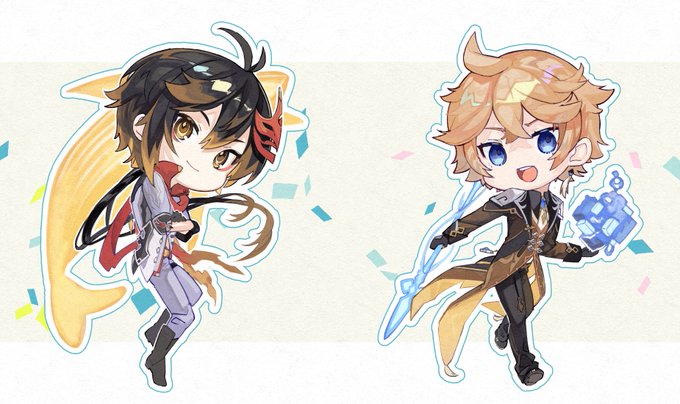 たるたる誕生日おめでとう。 親衛隊な鍾離先生と空くん描きました。 #タルタリヤ誕生祭2021 #原神