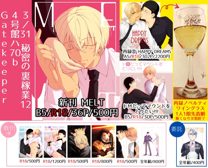 おはようございます!今日は4号館ハ70b Gatekeeperにて参加してます!新刊のMELTと東京春コミの新刊と再録とワイングラスも持ってきてます!!!!よろしくです!!!!