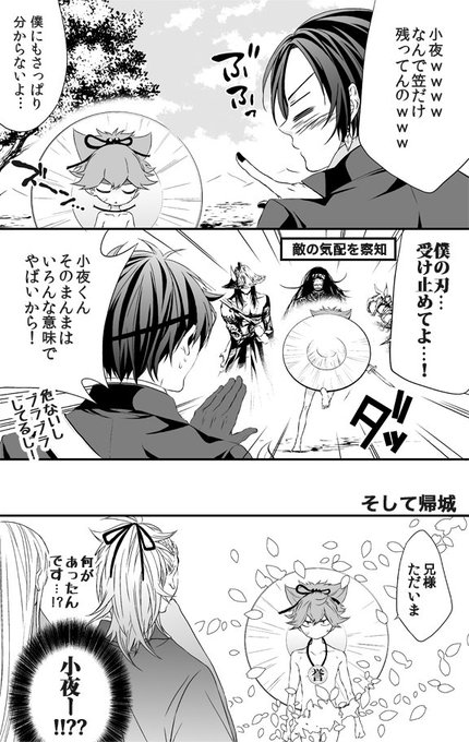 朝寝坊左文字 江「宗三!裾まくるのお止めなさい!あとそれ私の袈裟ですよ!」 宗「そういう兄さんこそ小夜の…」小夜「!?(裾踏んだ)」 江・宗「「小夜ー!!??」」