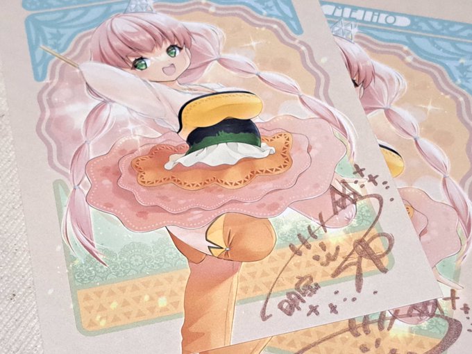 今年も明宝ハム姫ちゃん描きました。グッズはポストカードのみですが、去年の絵柄のは明宝特別仕様なサイン入り。画集と共にレジ横にあるそうです😊
