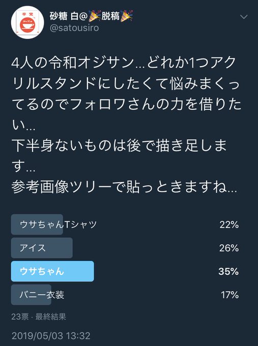 フォロワのみんなーーー優柔不断な私に変わって投票ありがとうございます!!!!!! ウサちゃんをアクスタにします!!飾るぞ〜😘😘😘😘