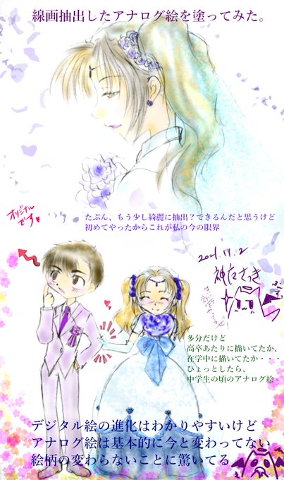 今日はアナログ絵を線画抽出という技法でデジタル加工してみました。加工というレベルでもないかもしれませんが、今の私に出来るレベルで頑張って色塗りもしてみました。過去絵ですが、私はアナログだとあまり今と絵柄が変わらないタイプです。