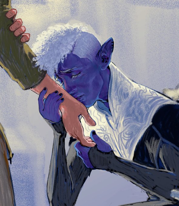 more work on that shadowgast wrist-kiss WIP, which is becoming tenderer with every brush stroke. Look, a background! And Caleb has an actual face now!