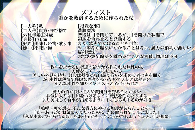 魔法使いの杖(@mahoutukainotue)に12人目失礼します。 信者達の祈りから作られた杖のメフィストです。無性です。 関係はまっさらなので、よければ遊んでください。 まったり主人も募集してますので合わせて、よろしくお願いします! #魔法使いの杖 #まほつえ_杖