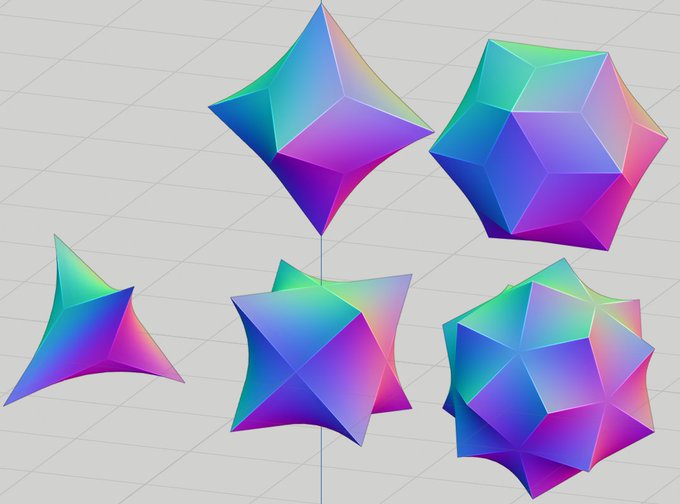 三種類の円柱(奥)に subdivision surface を掛けてみた結果(手前)。見た目は同じだけど、底面の中心のトポロジーが異なる。左から順に、1) 見た目通りの三角ポリゴン、2) 四角ポリゴンの中心に面積ゼロの多角形、3) 四角ポリゴンの中心に穴。 #Blender3D