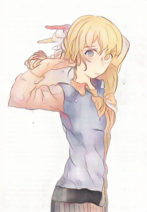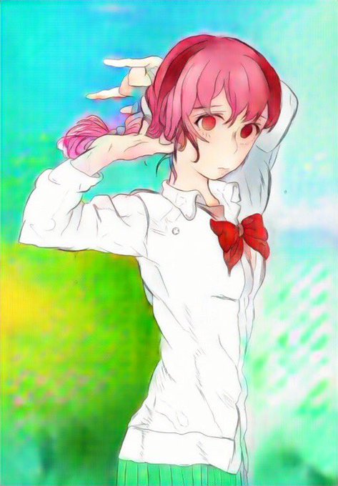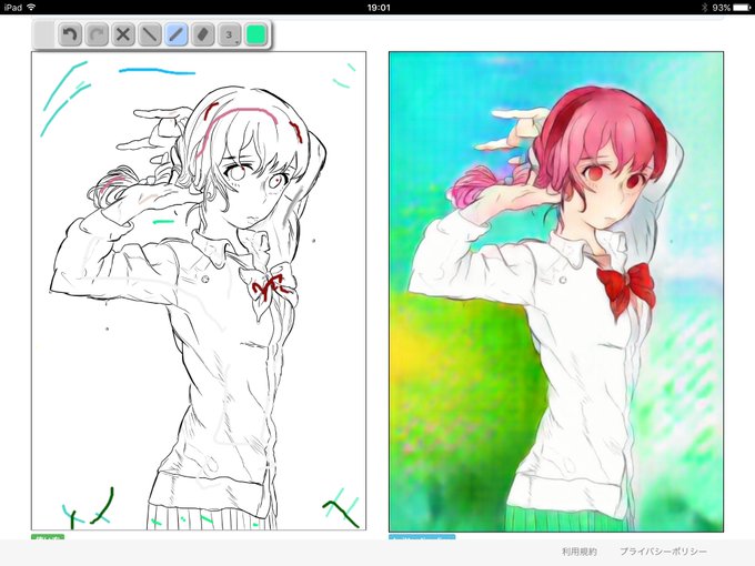 #paintschainer 何年か前に描いた聲の形西宮さん模写絵を自動着色してみました。色置きしたらそれっぽい。三枚目は色置きをせずに生成したもの。