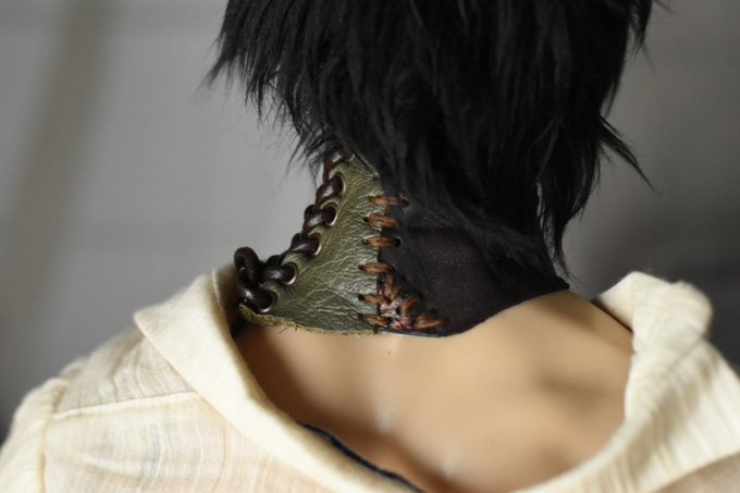 そんなこんなで少し前に作っていた革の何やらはこれです。ネックコルセットと言えるのかは謎だけれどもそれに類した物。ポイントは革を継ぎ接ぎにした事、コルセットを留める場所をサイドに持ってきた事、形も左右不均等。継ぎ接ぎのネックコルセットって良いなと思ったのさ。趣味の詰め込み好き放題。