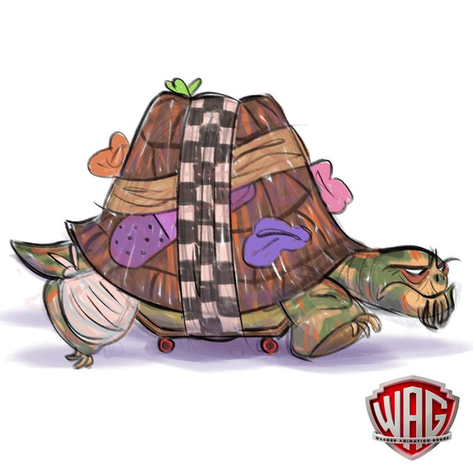 In 2017 I did some super early development on DC League of Super-Pets. For Merton I decided to play around with an idea that he had been found with a cracked shell by a little girl who took him home and tried to patch him up with bandaids, rubber bands, gum, and a C-clamp.