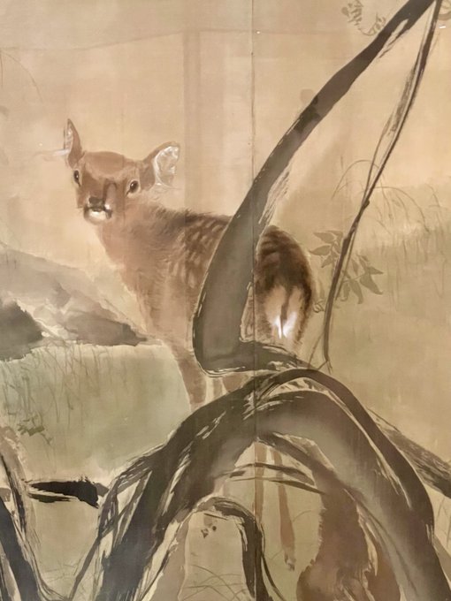 特に得意とした動物画がいい。描かれた馬や鳥から、画家の慈愛に満ちたまなざしを感じる。《細雨・落葉》の仔鹿のつぶらな瞳とキュートなお尻は、もう。🥰
