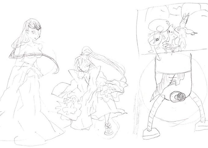 @lal_fwa 打ち上げで描いた個人的『ゲーム・オン!』(LALの特集が多く載っていた小学館のゲーム雑誌)おすすめポイントうろおぼ絵と答えあわせ。天草のスニーカーと淀君の髪の謎浮力、タロイモのタロイモ。本当にうろおぼえすぎた..