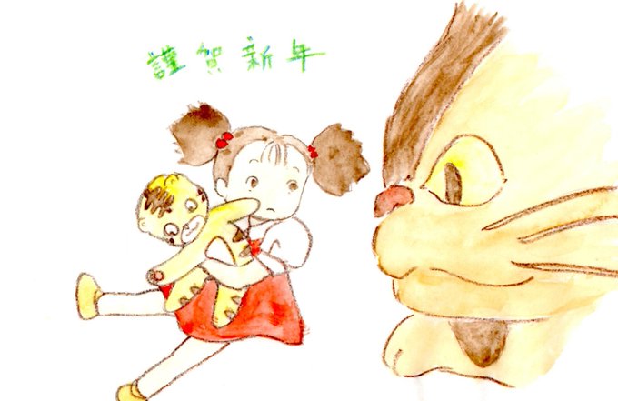 #年末大掃除で発掘されたのでみてみてする ジ〇リで干支一周をした時の年賀状です! 自分でもよく頑張ったと思う。 ※絵に直接住所を書いていたため消しているので色が変になってるところがあります。 【子】