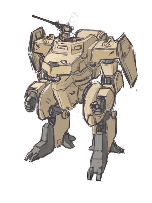 ガルムザインの量産型モブメカにして現時点での主人公の乗機、「サエモド」のラフ(右)をもう一段階進めました(左)。 ここまで詰めればあとは線画に入れますかねー……