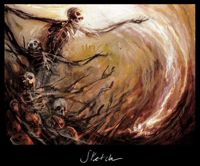 Sketch for "Unholy Indenture". AD: Taylor Ingvarsson. Art Description: "Out of a sea of tormented souls, one human male is pulled back to life through dark magic. As the figure is pulled out of the sea their flesh begins to be remade and some of their armor starts to return... "