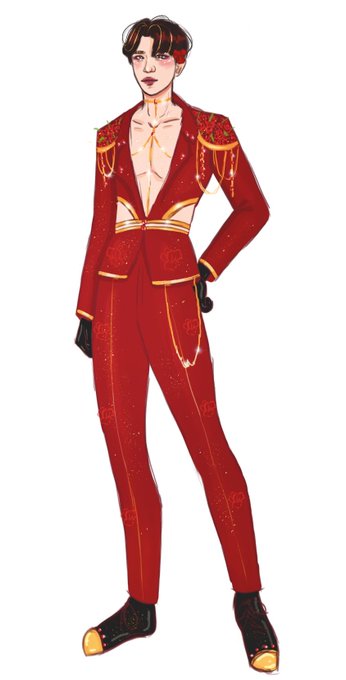All 5 are taking too long so I’ll just post these 2 first, but I decided to design outfits for the boys in various concepts 👀 inspired by their want for a sexy comeback and love of unique bold fashion