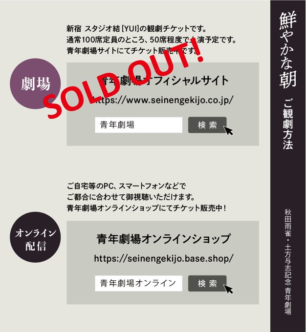 小劇場企画「鮮やかな朝」は全日程売切れになりました。