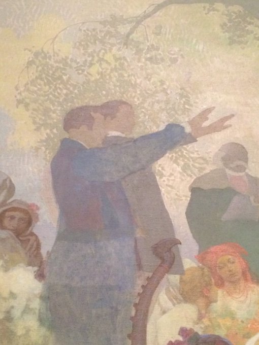 この絵は、鉤十字に似たマークがあるだのハイルヒトラーぽい人物がいるだの周りにとやかく言われミュシャはもう嫌になったのか(笑)完成させなかったらしいという話を聞いたことある。勿体ない。