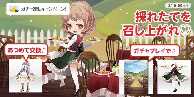 【ガチャ】ちっちゃくてかわいい仲間たちと農園で収穫♪あったかキュートなニットスタイルやラブリーなワンピスタイルをチェック☆回数プレイでテラスの背景も!くわしくはガチャページで♪ #atgames #ポケットランド