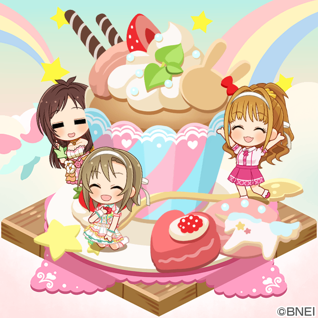 🍛「今日の私はキュートアイドルですよ!!!」 🎧「ロッ…キュートに決めますよ♪」 🍎「二人とも素が出てるんご…」 #imascg_snap #ぷちスナップ