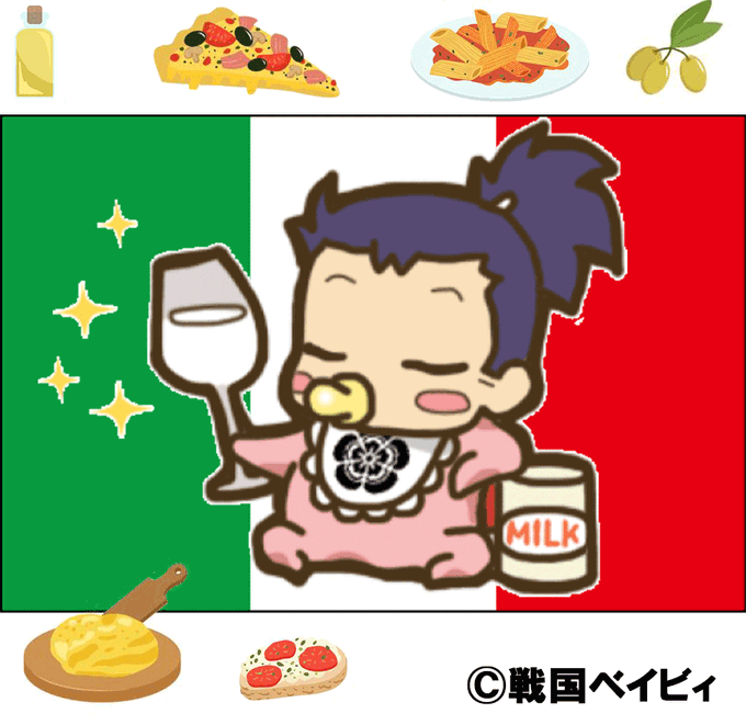 おはようございます☀️ 本日は #イタリア料理の日 らしいでしゅ‼️信長たんはワインが好きでちたね🍷✨ #line #戦国 #戦国武将 #戦国ベイビィ #LINEスタンプ #歴史 #イラスト #キャラクター #織田信長 #みんなで楽しむTwitter展覧会 #一日一絵