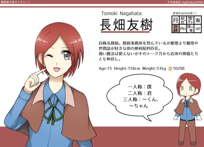 12人目。街探偵という名の便利屋長畑くん。コミュ力の鬼で物語の中では案内役ポジション。キュート男子なのかオネェなのかわからないところがある。ほっぺの赤いのを忘れてはいけない(戒め)