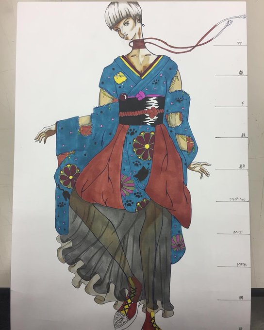 SNS遡ってたら 服飾の学校に通ってた時に描いた デザイン画が出てきたからリメイク わっ、6年前だ...... #イラスト #和服 #服飾