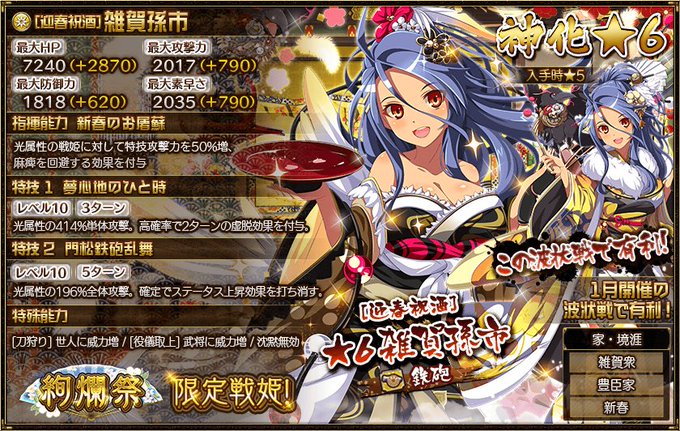 新年を迎え、初詣のおみくじで大吉を引き当てて以来、いいこと続きですっかりご満悦な彼女は仲間と一緒にお酒を飲んで楽しい時間を過ごしていたそうなのですが、実は大切な人への挨拶ができていなくてむずむずしていたのだとか……! 孫市ちゃんは意外と乙女ですね~。 #戦プロ